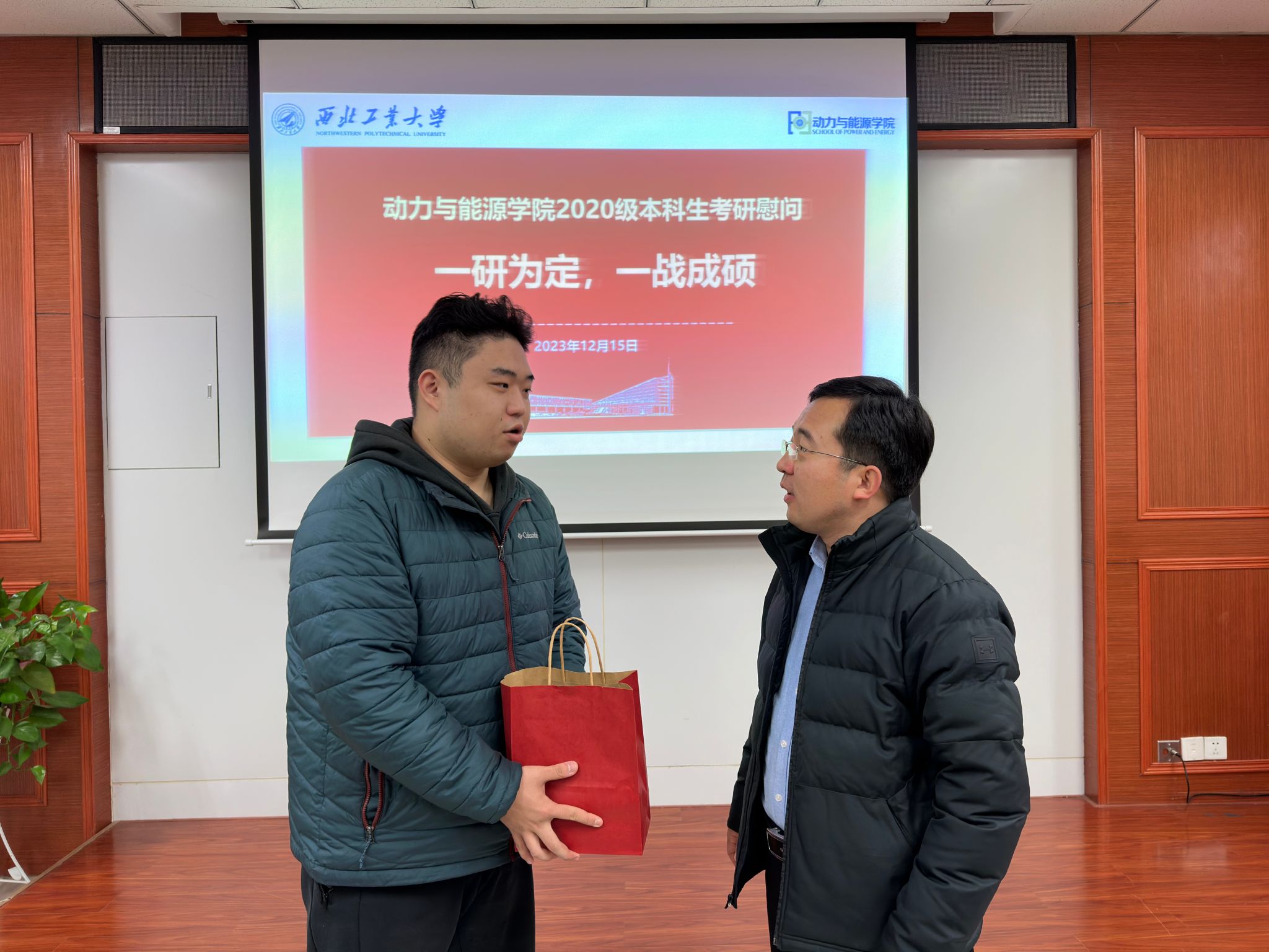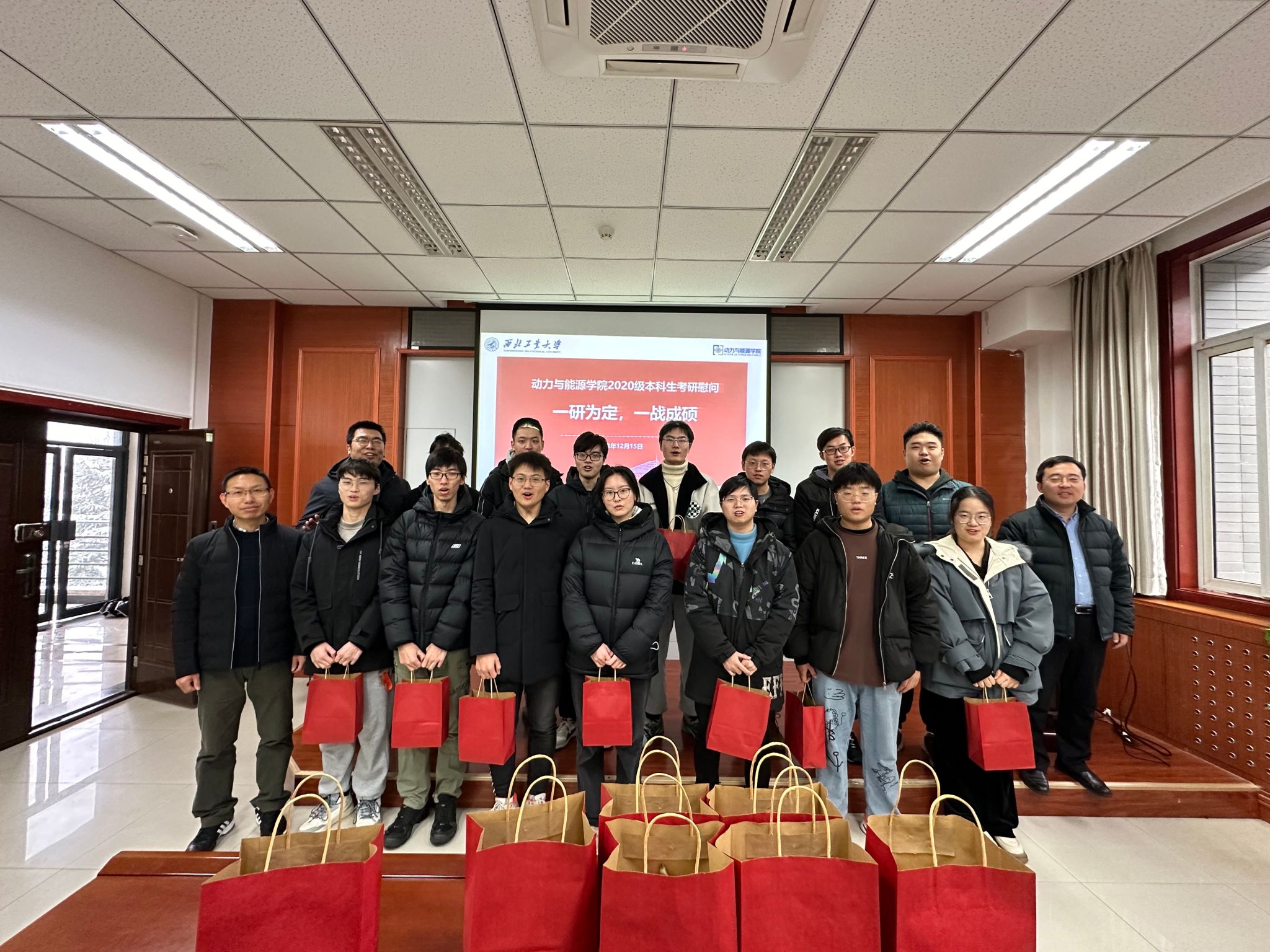 今天雪下得很大,天气很冷,但是我很开心、很温暖。我明白,即将迈上考研战场的我从来不是一个人在战斗!我的背后有着学院的支持和老师的鼓励。今天的慰问就像雪中送炭一样,我感觉我现在充满了力量,接下来的一周时间,坚持不松懈,我们一研为定!