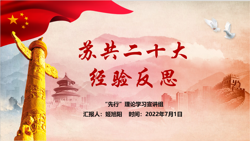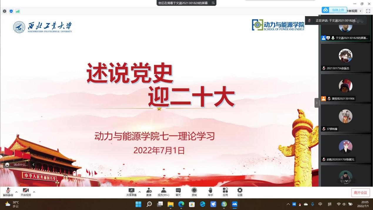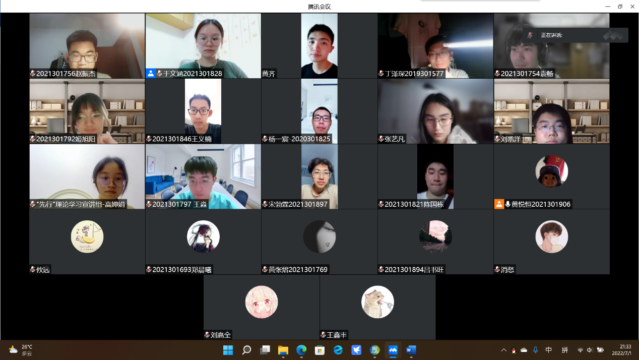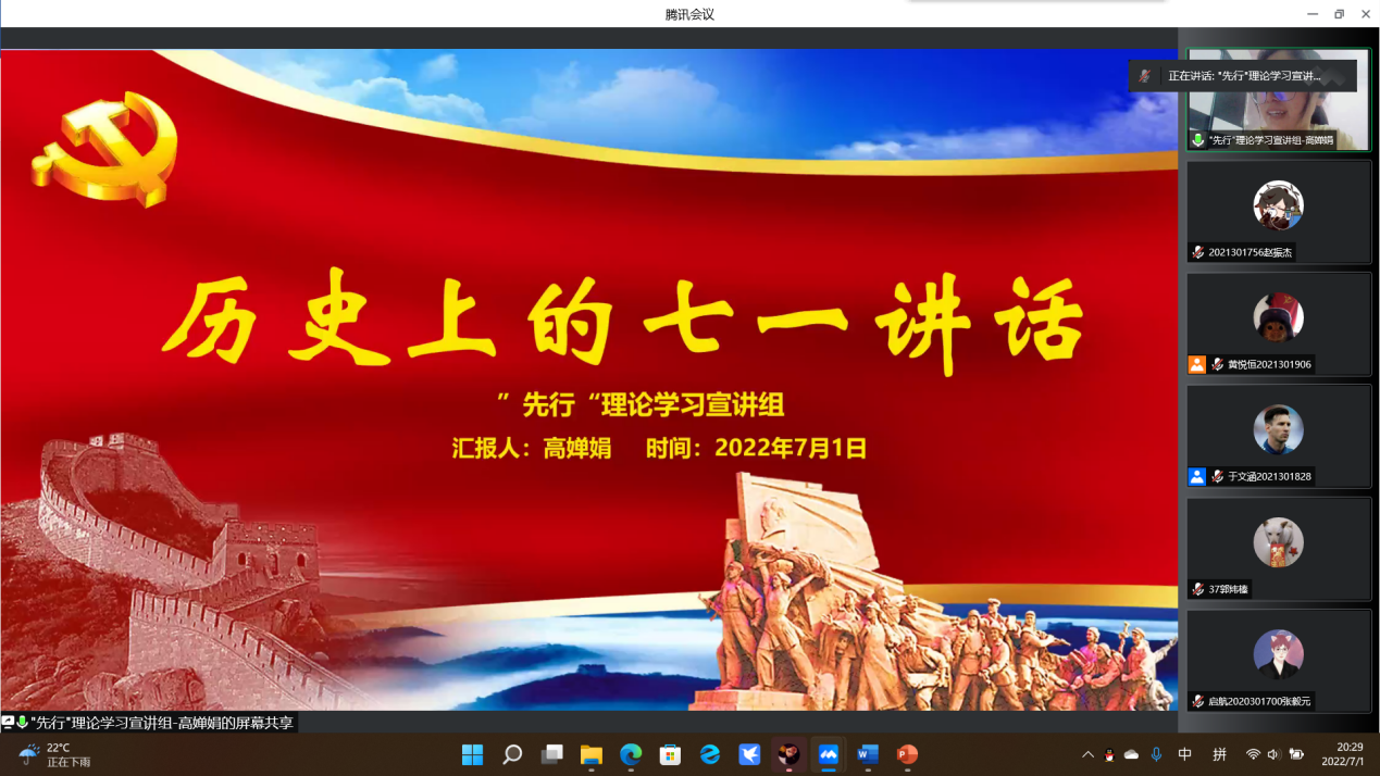 院会特于七一建党节之际邀请“先行”理论学习宣讲组于2022年7月1日晚作主题为“述说党史,迎二十大”的理论宣讲,鼓励全院学生坚定历史自信、筑牢历史记忆,满怀信心地向前进。参会人员有:学院党委副书记刘海涌,学院兼职辅导员武雯梅,理论宣讲组全体成员,学院学生会全体成员以及各班团支书及入党积极分子。