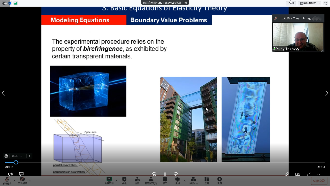 《非均质热弹性力学》的主讲教师Yuriy V. Tokovyy教授是乌克兰国家科学院皮斯特哈奇力学与数学应用问题研究所固体力学研究室主任,乌克兰国立利沃夫斯卡理工大学应用数学与基础科学系教授。在《非均质热弹性力学》课程中,Yuriy V. Tokovyy教授采用板书与PPT相结合的方式对课程的内容进行讲解,深入浅出的为同学们讲解了一般流变学的基础知识和固体力学的基本原理、非均质固体热弹性力学的主要数学模型、非均质结构单元的热弹性力学初始-边值问题与梯度材料的偏微分方程等问题的求解方法,通过非均质性、一般和准各向异性的概念来说明材料特性的影响,采用局部梯度理论解决小尺度力应用问题。为了让同学们的理解更加深刻,Yuriy V. Tokovyy教授结合工程实际讲述非均质热弹性力学中涉及的概念与规律,并带领大家一步一步推导公式。对于同学们提出的每一个问题,Yuriy V. Tokovyy教授都会耐心解答,并给同学们很多宝贵的建议,同学们都有很大的收获,对非均质热弹性力学有了更深的理解。