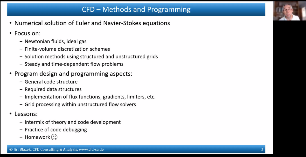 《流动数值模拟基础》这门课程的授课老师Jiri Blazek教授是计算流体力学经典专著《Computational fluid dynamics: principles and applications》的作者。在课程中,Jiri Blazek教授为同学们讲授了计算流体力学的基本原理,并介绍了计算流体力学求解器开发的整体框架,让大部分没有相关的开发的CFD求解器的同学得以了解并快速入手。然后Jiri Blazek教授又通过讲授和编程结合的方式,介绍了一维欧拉方程求解器、二维结构/非结构网格的欧拉/NS方程求解器开发,具体包括公式推导、代码结构建立、空间离散、边界条件设置、时间推进方法和多种加速手段。课程中,Jiri Blazek教授不仅现场进行求解器的开发,同时还将部分子程序留做作业给同学们,从而让课程中所有同学均参与到求解器的开发中。通过这种讲授、编程结合的方式,同学们对计算流体力学求解器编程相关知识有了深入浅出的理解,并掌握了一定的实际应用能力。