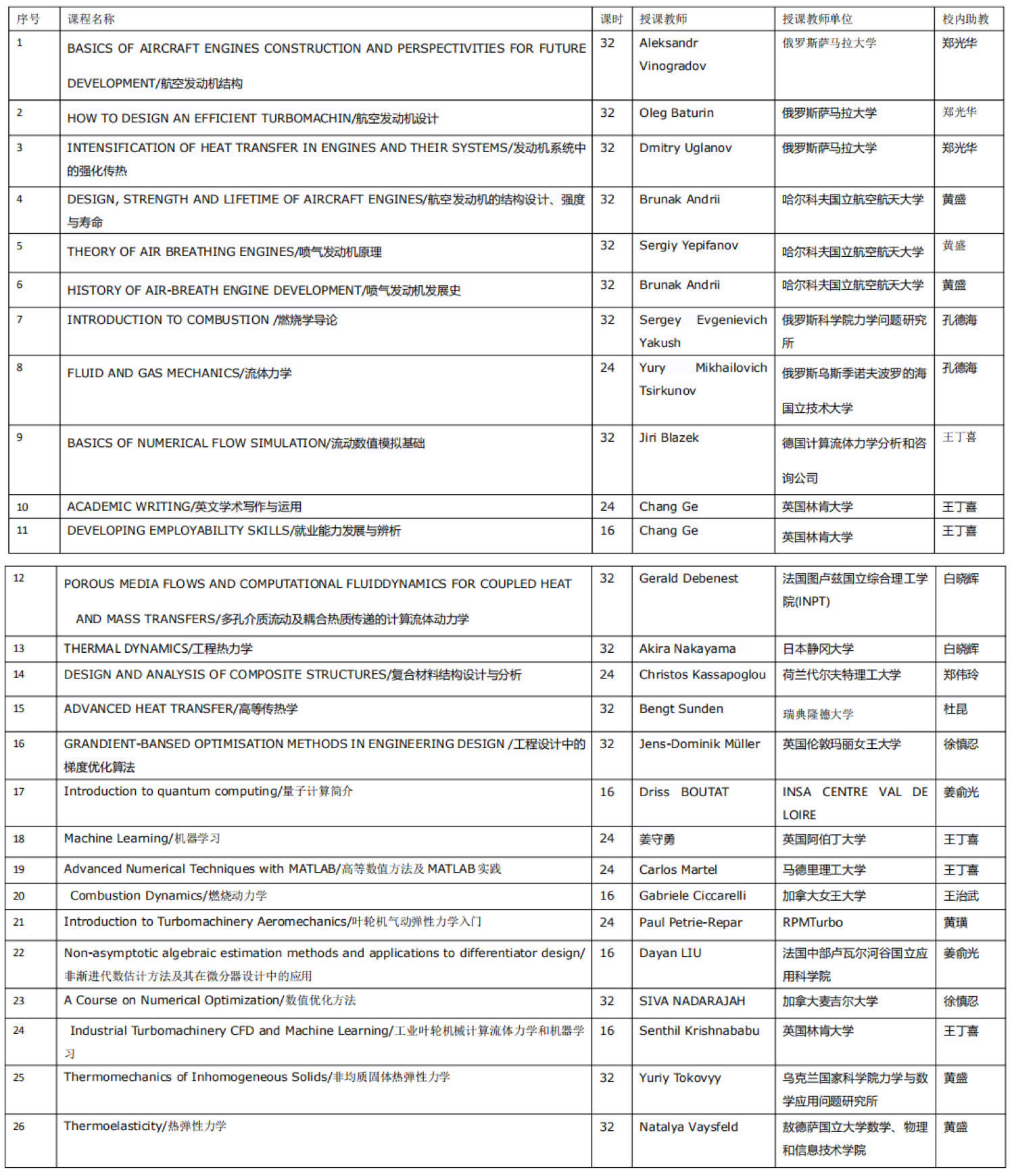 开展“在线暑期国际学堂”,力邀来自来自俄罗斯、乌克兰、德国、法国、日本、英国、西班牙、荷兰、瑞典、马来西亚、加拿大、澳大利亚、中国13个国家的24名著名专家在线授课,其中包含1位院士、16位教授、 6位副教授、1位研究员。本次暑期国际学堂开设了26门课,共有600余名学生参与。此次暑期学堂不仅为同学们提供了学习发动机及其他专业知识的国际化平台,更是帮助同学们拓展国际化视野,提升英语水平和文学素养,促进学生们的全面发展。26门课程信息如下: