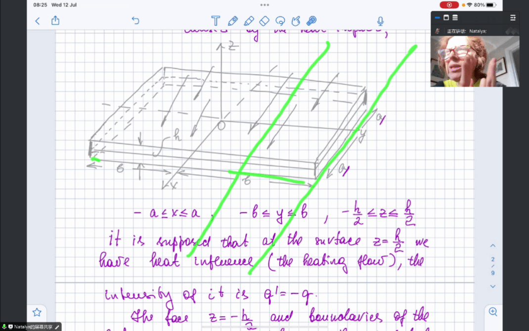 Natalya教授结合清晰的板书和耐心的讲解,带领同学们完成了2023年暑期学堂《热弹性力学》课程的学习。本课程让我们对热弹性力学有了初步认知,掌握了相关定理和求解热弹性力学问题的思路,并且提高了我们推导数学公式的能力。为了让同学们掌握热弹性力学中的定理和公式,Natalya教授细致地对每组方程进行推导,并结合简洁明了的示意图帮助同学们更直观地理解与问题相关的模型和求解过程。同时教授非常关心同学们对课程的掌握情况,每节课都会耐心地询问并解答同学们的问题,会为同学们额外补充一部分大家未曾学习过的数学知识。Natalya教授授课风格条理清晰、严谨认真,语言生动形象,并且教授的数学和物理功底非常雄厚。Natalya教授的《热弹性力学》不仅为我们带来了热弹性力学的知识,还加强了我们数学公式推导的能力,尤其是偏微分方程求解,对我们今后学习任何一门理工类课程都具有一定程度的帮助。