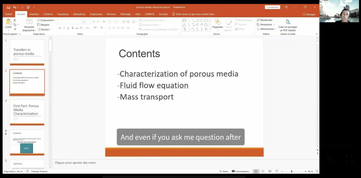在Gérald Debenest教授的讲授以及助教老师白晓辉老师的帮助下,《多孔介质流动及耦合热质传递的计算流体力学》顺利结课。该课程主要介绍多孔介质流体流动中的热量耦合传递、热力模拟及热力计算。课程中,Gérald Debenest教授对多孔介质中达西定律的推导与公式修正、多孔介质中热传导与对流换热方面的质能传递以及COMSOL模拟分析等各个理论基础方面进行了细致的讲解;Gérald Debenest教授还亲自演示了多孔介质流体流动模拟仿真的过程并进行动力学分析。在授课中教授注重教学与实践相结合,不断鼓励学生们积极讨论,在认真完成课后作业及纠错的过程中,同学们受益匪浅。