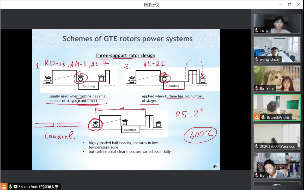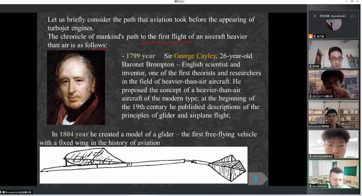 在《喷气发动机发展史》课程中,Brunak Andrii研究员采取ppt与生动的绘图演示结合的方式详细讲述了喷气发动机的发展历史,包括各国(美国、英国、俄罗斯等)发动机的发展和各类型发动机(涡喷、涡扇、涡桨等)的发展历史。在讲解过程中,Andrii研究员思路清晰、语调平缓,讲课风格轻松风趣,与同学们积极互动,针对课堂上同学们提出的疑惑与问题分别进行详细的补充讲解,易于学生对课程内容的理解。在课后通过积极反馈同学们的意见与建议,不断调整以保证授课质量,因此整体上同学们对该课程的反馈良好,评价很高。