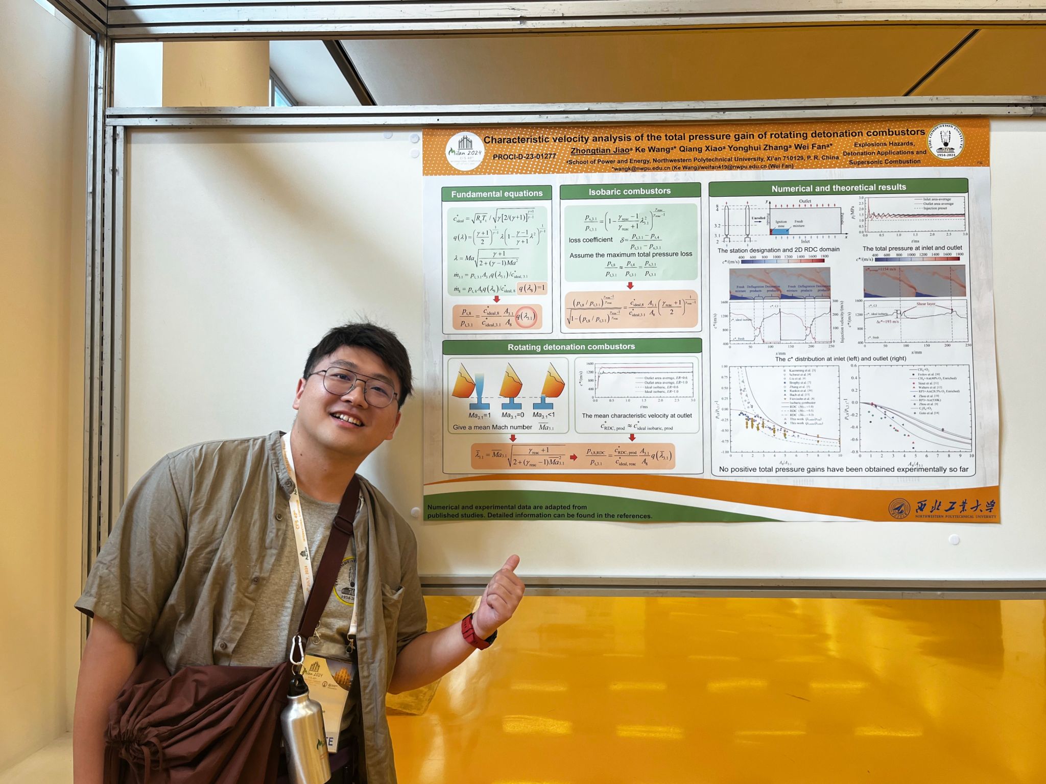 博士生焦中天做了题为“Characteristic velocity analysis of the total pressure gain of rotating detonation combustors”的海报展示。汇报以推进领域广受关注的旋转爆震燃烧室总压增益特性为背景,针对数值研究与实验结果中旋转爆震燃烧室增压能力的巨大差异,借助火箭发动机推力室设计常用的特征速度概念,剥离了在旋转爆震中紧密耦合的喷注和燃烧过程,构建了等压燃烧室与旋转爆震燃烧室总压增益(损失)与燃烧室出入口面积比的解析评估方法,为旋转爆震的燃烧室设计、总压增益能力的评估和优化提供了重要参考。 (论文原文://doi.org/10.1016/j.proci.2024.105626