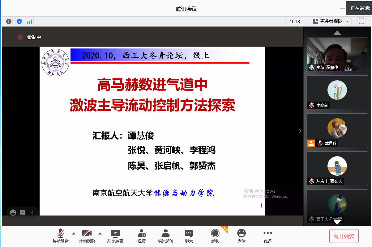 首先,南京航空航天大学谭慧俊教授作了关于“高马赫数进气道中激波主导流动控制方法探索”的学术报告。谭教授从研究背景、前体激波系调节、激波/边界层干扰控制、喘振(运动激波主导)抑制等四个方面进行了深入浅出的讲解。会后,谭教授的报告带来了热烈的讨论,很多参会者通过线上积极提问,谭教授进行了详细的解答。