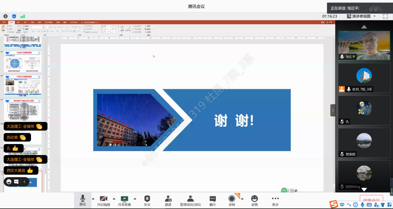 任静教授系统介绍了航空发动机热端部件冷却系统概念、分类以及工程应用前景,并详细阐述了不同冷却单元(技术)的冷却机制及其在航空发动机热端部件应用的发展趋势,最后针对双层壁冷却技术的技术特点及其在下一代航空发动机热端部件的应用潜力进行了重点讲授和展望,最后任静教授与参会老师和同学们进行了深入的交流讨论。