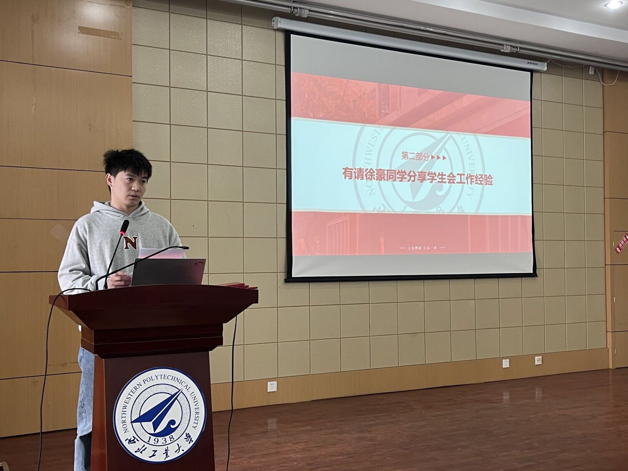 大会第二项,由学生会成员徐豪作为优秀志愿者代表做工作经验分享。徐豪同学讲述了自己的工作经历与心得体会,鼓励更多的志愿者牢记宗旨、积极奉献、认真负责,参与到服务同学的行列中,为学院学生工作贡献自己的力量。