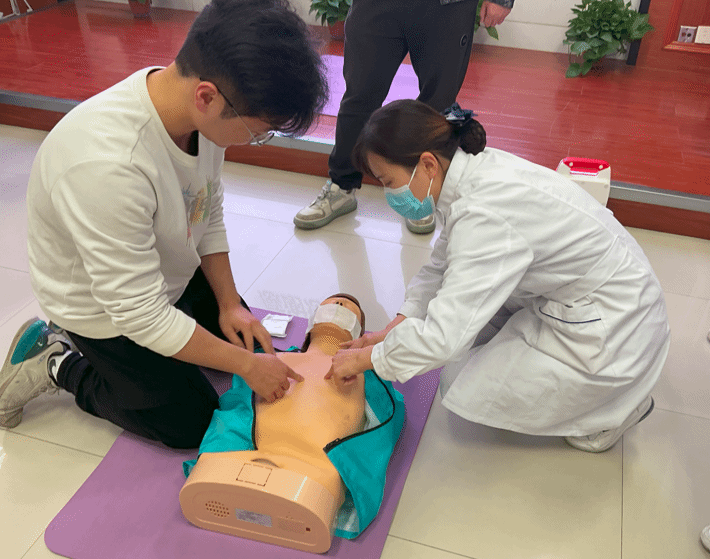 此次讲座不仅科普了理论知识,还有相应的实践环节。老师和同学们跟随护士进行了肩颈保健操的学习,并在专业指导下进行心肺复苏、AED使用和海姆立克急救演练。