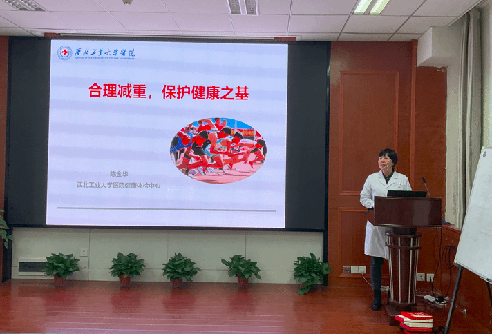 接下来由陈金华根据学院老师体检情况做出报告,她根据体检报告分析各年龄段高发病症,发现超重肥胖占首位,于是从饮食、运动、心态、睡眠四个方面提出控制体重的方法和预防肥胖的建议。