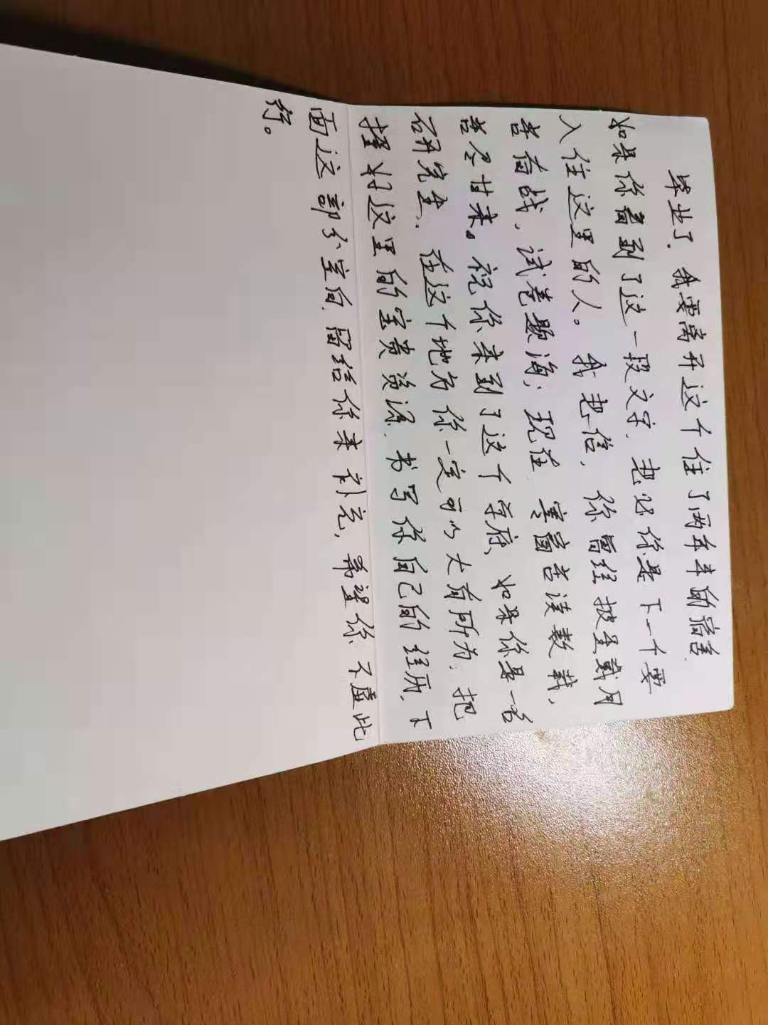 “毕业了,我要离开这个住了两年半的宿舍。如果你看到了这一段文字,想必你是下一个要入住这里的人。我相信,你曾经披星戴月苦奋战,试卷题海;现在寒窗苦读数载,苦尽甘来。祝你来到了这个学府,如果你是一名研究生,在这个地方你一定可以大有所为,把握好这里的资源,书写你自己的经历,希望你能够不虚此行!”