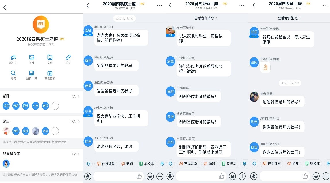 座谈会上,导师代表向所有即将毕业的同学送上了诚挚的祝贺。同时,依托线上平台,师生们畅叙离别之谊、感恩之情,诉说防疫期间的生活状态,分享读研期间的成长与感悟。同学们也对教研室、系、学院和学校的发展改革,以及研究生教育管理等方面提出了宝贵的意见和建议。其中,航空推进系的硕士毕业生曹志博(2020级博士生)作诗一首,以表达对导师以及全校教师的感激之情。