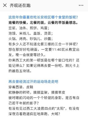 校园。其中《长安校区这十年》《谨以此文献给生死未卜的三哥》等文章累计阅读量上万,在同学中间产生一定影响。