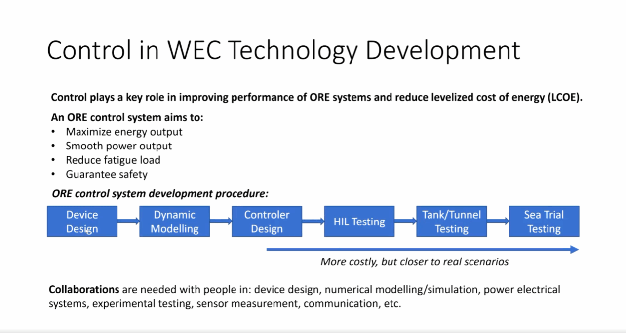 接着李光教授简单讲述了波浪能的发展历程。在1970年代,随着世界石油危机的爆发,波浪能开始发展,至今已经有50多年的历史。世界上大部分波浪能装置集中在欧洲,李光教授重点介绍了其中三类典型的波浪能转化装置及其他们的控制问题,并对波浪能转化装置控制系统的设计流程进行了系统详细的讲述,重点强调控制装置设计的目标是保证电能产量高且输出平稳,减少装置疲劳损耗以及保证装置安全性。最后,李光教授与参会人员围绕波浪能装置控制系统研究进行了热烈讨论,在碳中和碳达峰背景下,为国内新能源利用的发展做出了展望。