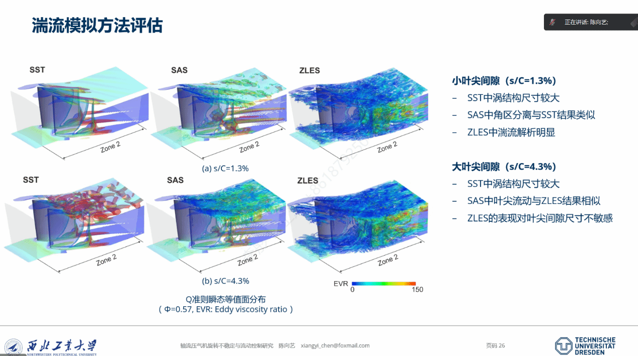 接下来,陈向艺博士通过对研究对象以及数值模拟方法的详细介绍深入剖析了旋转不稳定性。进行数值模拟时,湍流模拟方法与网格叶片通道数等许多因素都会数值模拟的效果产生影响。通过对不同条件下的模拟结果分析,陈向艺博士总结了旋转不稳定现象产生的两个准则及影响因素。