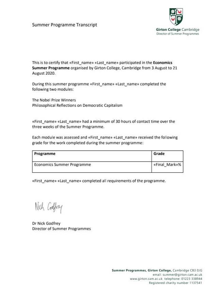 剑桥大学项目证书和成绩单样本(仅供参考)