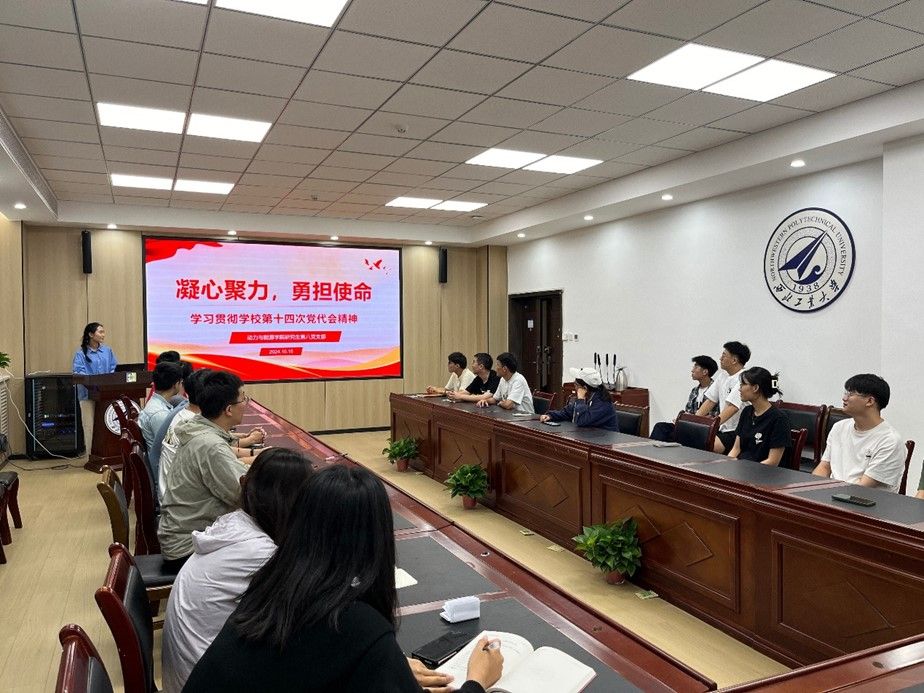 研究生第四党支部深入贯彻学习学校第十四次党代会精神。支部书记从三个方面讲解了党代会的重要内容和主要精神:一是如何理解和把握本次大会主题,二是回顾过去五年的成绩并希望支部成员不忘初心、砥砺奋进,三是从学校远景目标出发,结合第四党支部工作,谈及了支部在建设过程中遇到的问题,并提出了今后支部工作的新要求。此外,支部还倡导“双组融合”模式,鼓励成员间相互交流学业、科研和就业内容,促进共同进步。